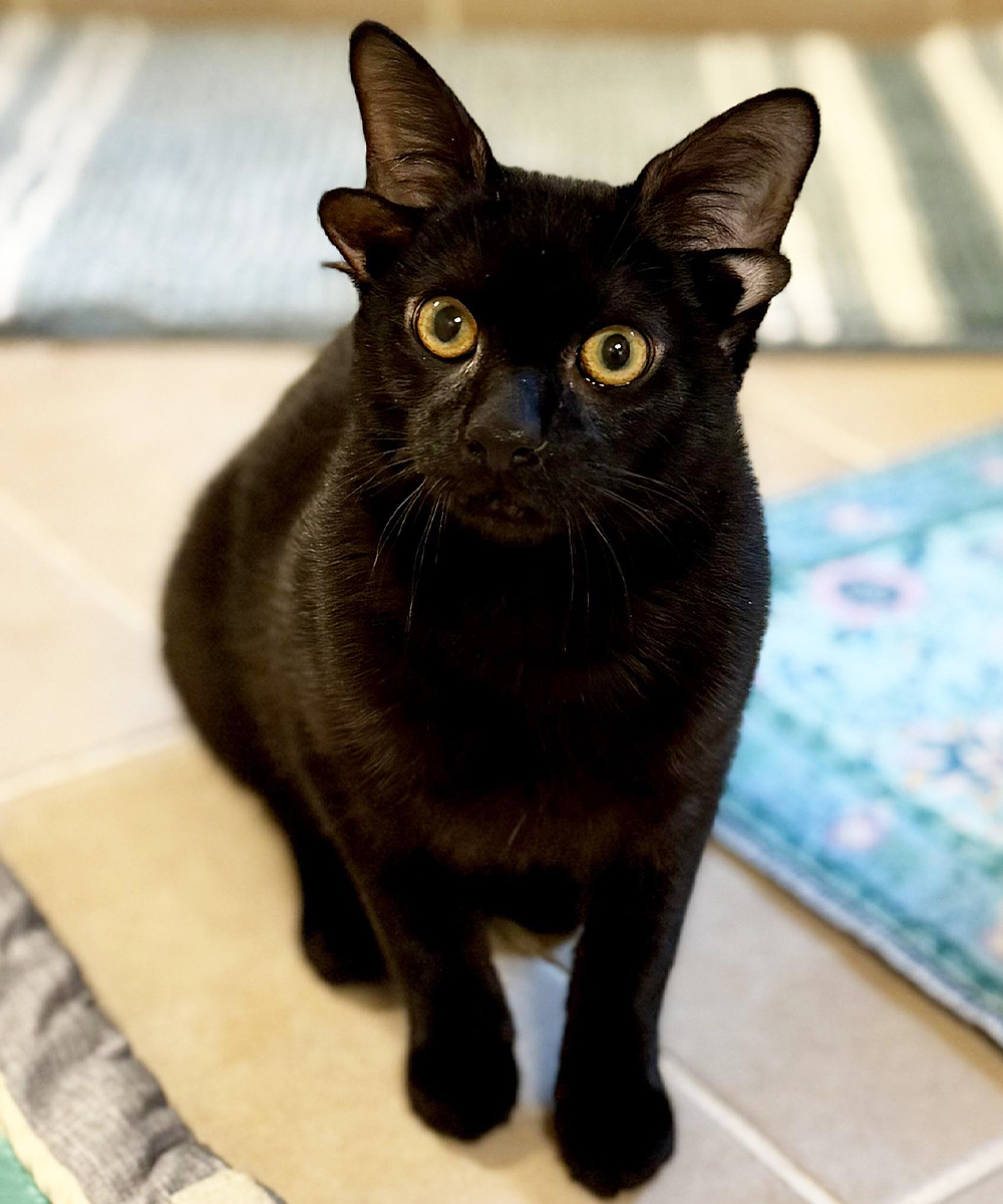 Meet Dobby a 7 month old black kitten who was born with a rare genetic mutation causing a curled tail, under bite and four “ears”!