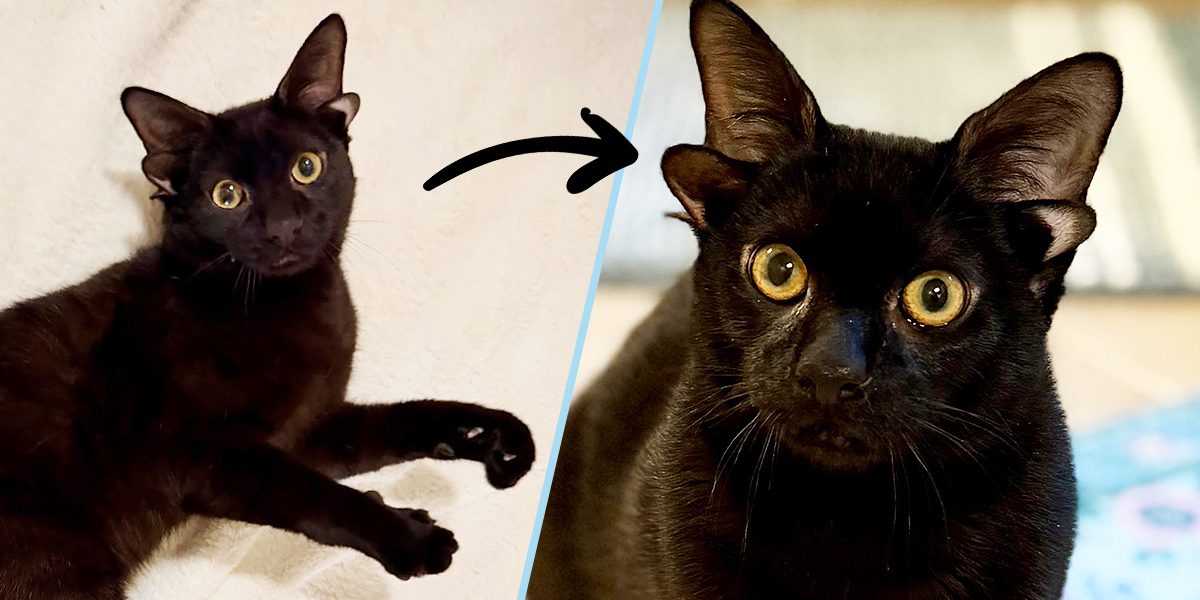 Meet Dobby a 7 month old black kitten who was born with a rare genetic mutation causing a curled tail, under bite and four